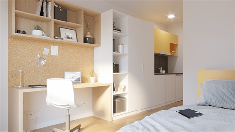W Student Depot w Gdańsku możesz zamieszkać w pokoju jedno- lub dwuosobowym o wysokim standardzie. W pełni umeblowane studio z prywatną łazienką i aneksem kuchennym zapewnia niezależność, wygodę i swobodę na co dzień.