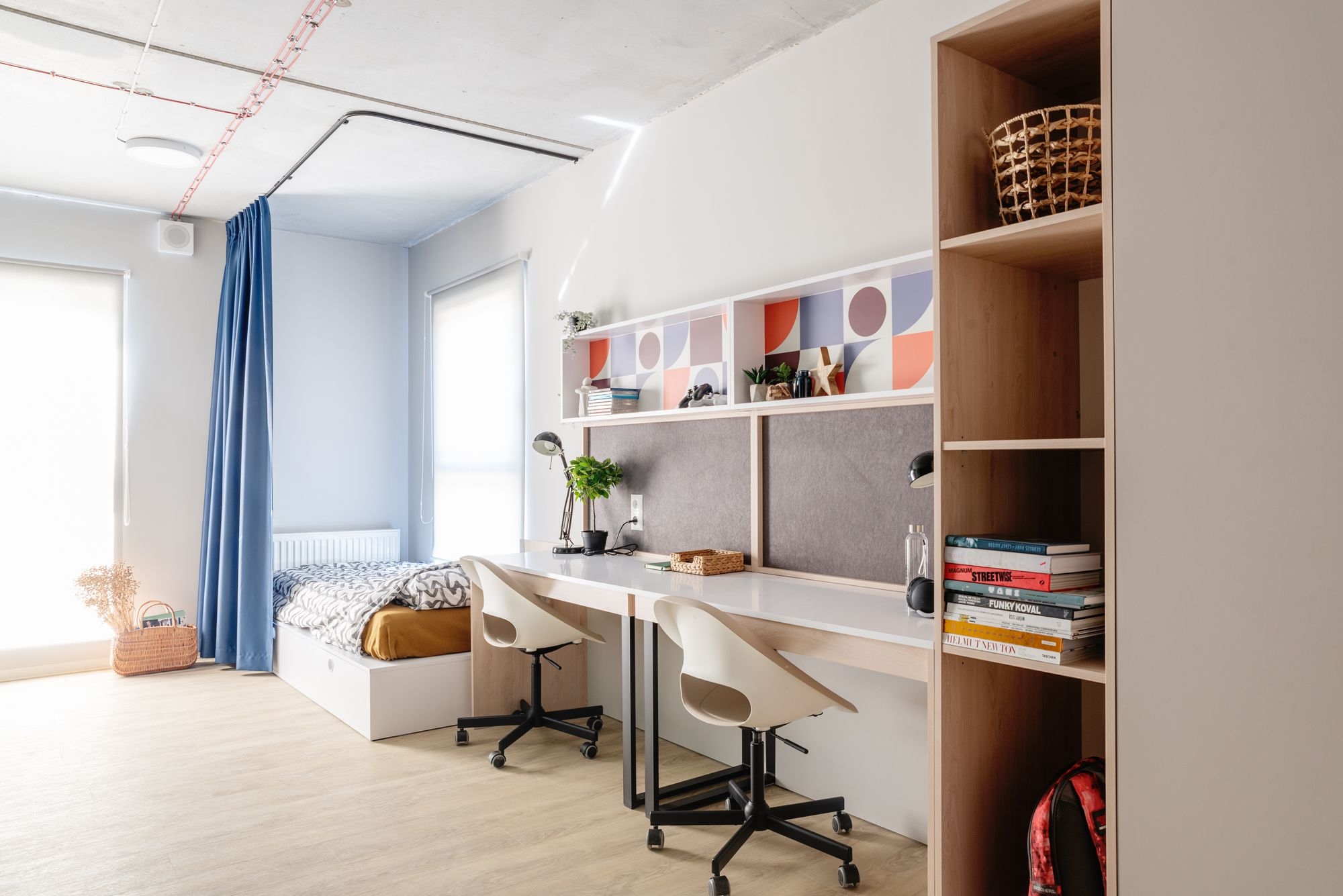 W Student Depot Łódź Wróblewskiego możesz zamieszkać w pokoju jedno- lub dwuosobowym o wysokim standardzie. W pełni umeblowane studio z prywatną łazienką i aneksem kuchennym zapewnia niezależność, wygodę i swobodę na co dzień.