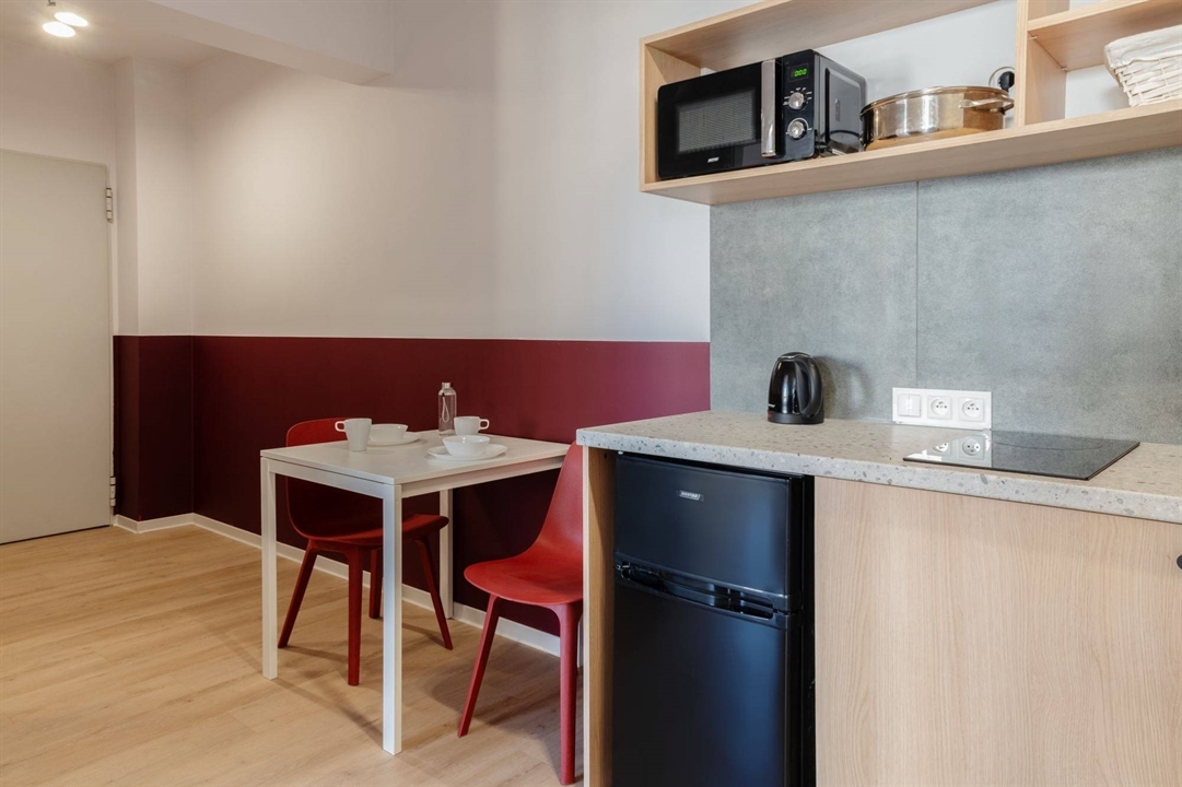 Wspólnie z drugim lokatorem korzystacie z nowoczesnej, przestronnej kuchni (11 m²), wyposażonej w lodówkę, płytę grzewczą i mnóstwo miejsca do przechowywania – gotowanie i wspólne posiłki nigdy nie były prostsze.
