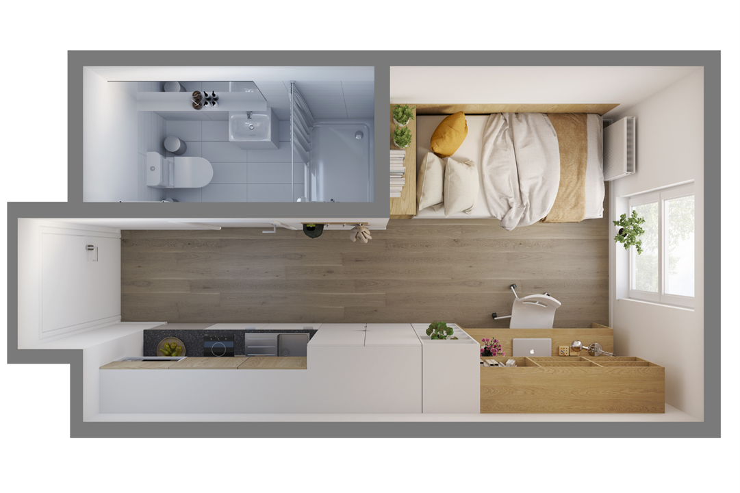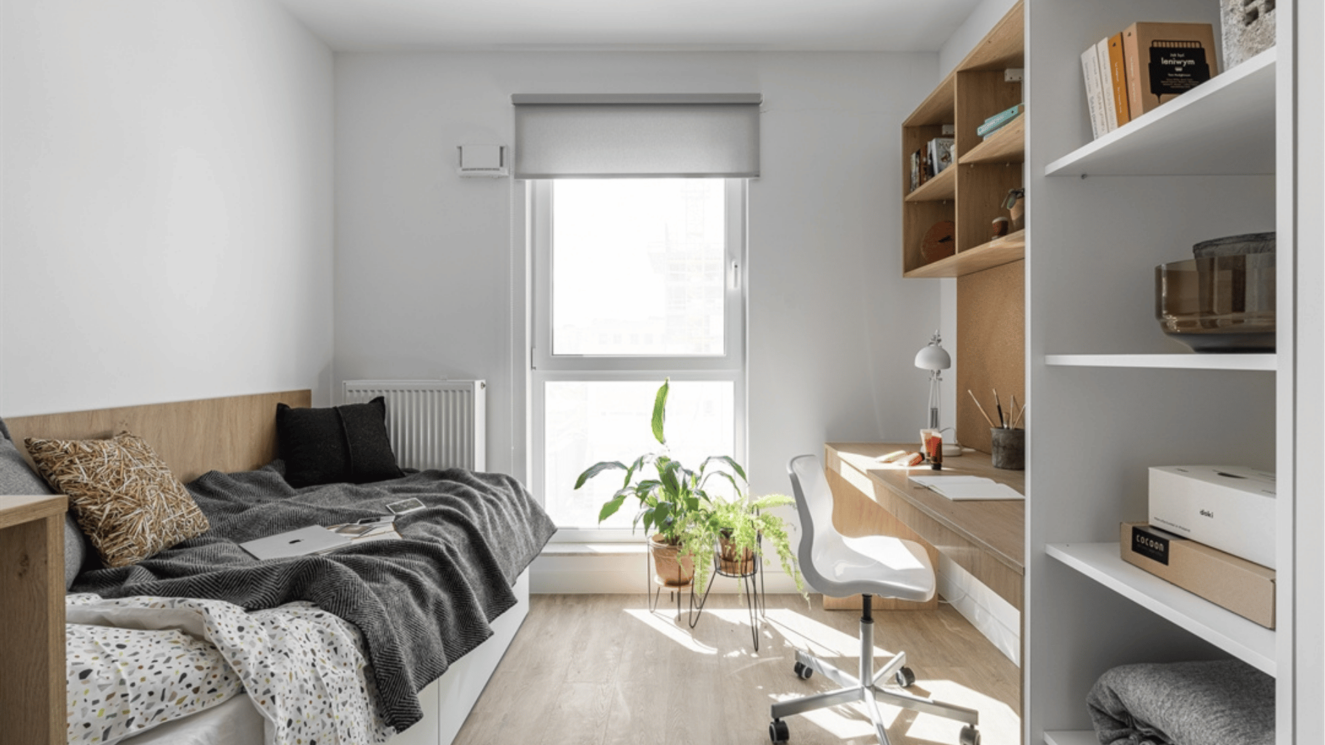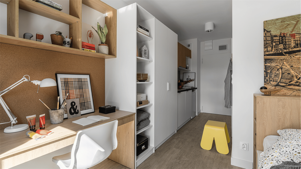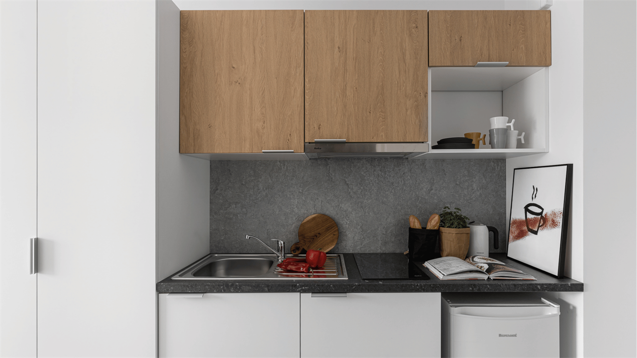 Szukasz przestrzeni, która daje Ci swobodę, komfort i spokój? Studio w wersji Nature to miejsce stworzone właśnie dla Ciebie – po intensywnym dniu zajęć potrzebujesz odpoczynku, ale także przestrzeni do pracy i twórczości. Wnętrze w odcieniach bieli i beżu sprzyja relaksowi, a 15 m² wypełnia wszystko, czego potrzebujesz: wygodne łóżko 90×200 cm, biurko z krzesłem, przestronną szafę oraz aneks kuchenny z płytą indukcyjną i lodówką.