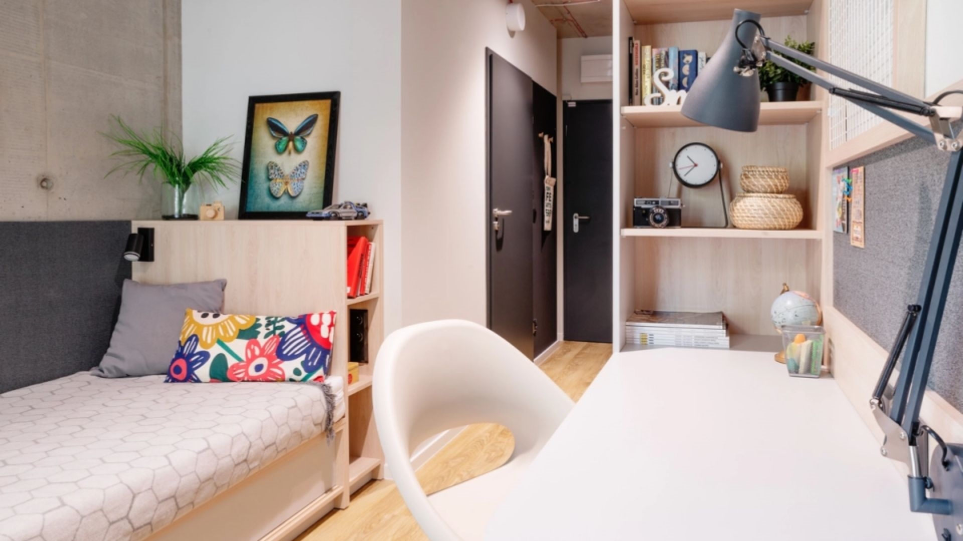 Masz tu wszystko, czego potrzebujesz – wygodne łóżko, przy którym aż chce się odpocząć po całym dniu, biurko gotowe na Twoje projekty (albo wieczorne scrollowanie), pojemną szafę na wszystkie outfity i aneks kuchenny, dzięki któremu nie musisz rezygnować z ulubionych posiłków. Do tego prywatna łazienka tylko dla Ciebie – zero kolejek, zero stresu.