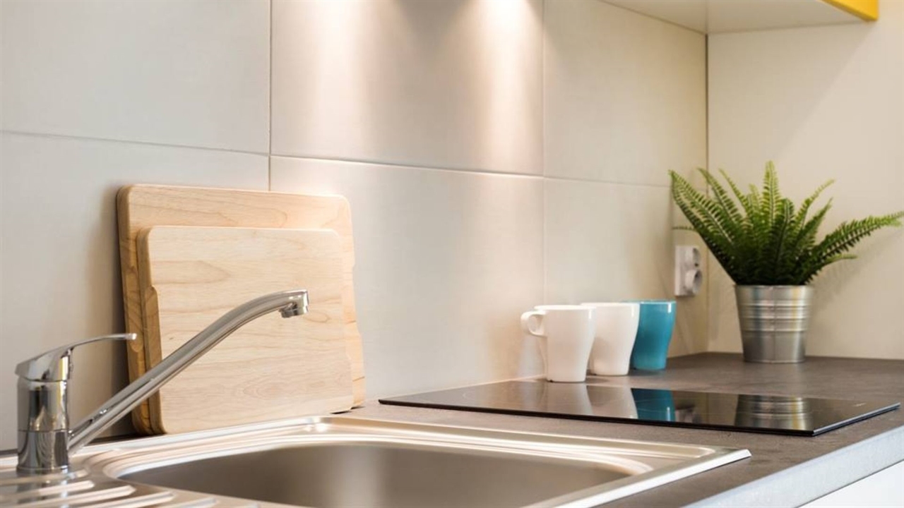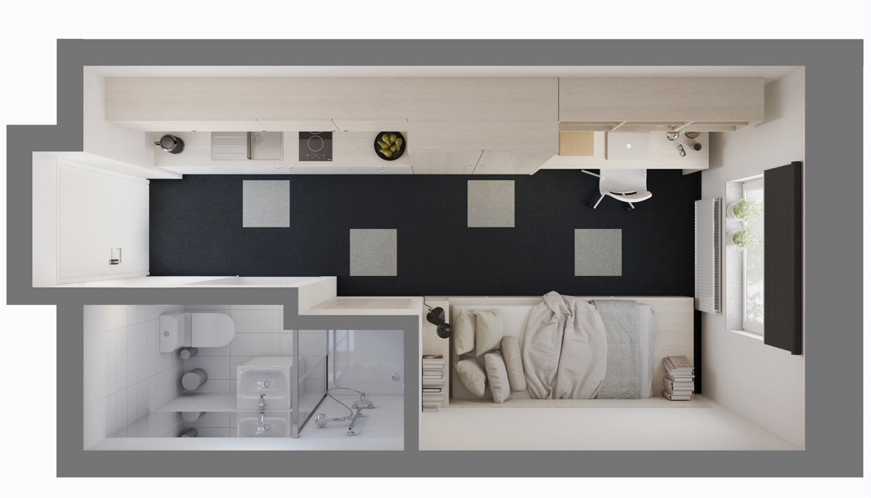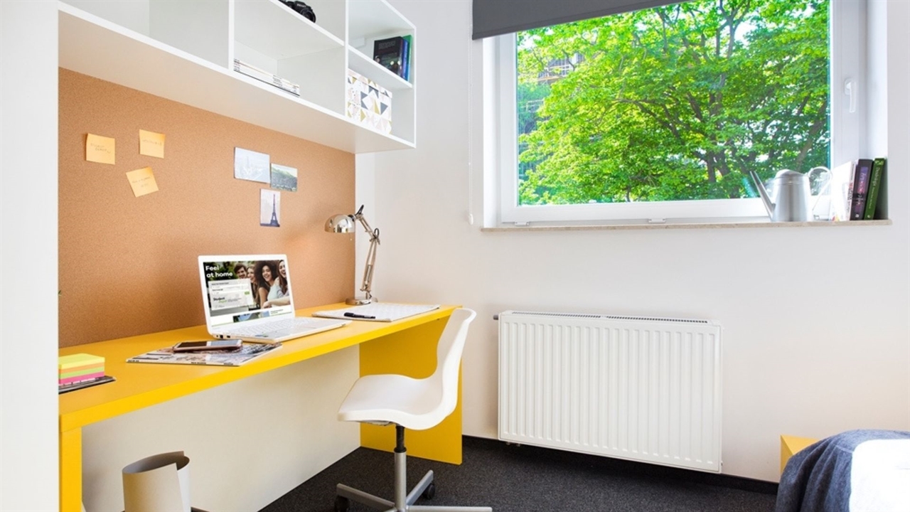 Na 16 m² znajdziesz wszystko, czego potrzebujesz, by mieszkać komfortowo i wygodnie studiować: wygodne łóżko, biurko z krzesłem, przestronną szafę, wiszące szafki oraz półki na książki. Aneks kuchenny z lodówką i płytą grzewczą sprawi, że gotowanie stanie się przyjemnością, a prywatna łazienka z wygodnym prysznicem zapewni Ci codzienny relaks. Dodatkowo, podłoga pokryta miękką wykładziną gwarantuje wyjątkowy komfort. W niektórych pokojach znajdziesz także wentylację mechaniczną – dla pełnej wygody przez cały rok.
