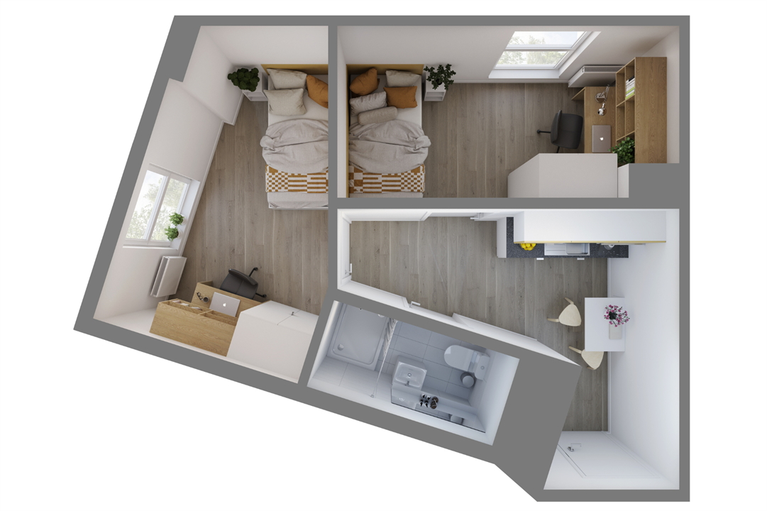 Twój pokój ma 9 m², jest w pełni wyposażony i zamykany na indywidualny klucz – masz więc pełną prywatność i bezpieczeństwo. Do dyspozycji masz wygodne łóżko, biurko z krzesłem, szafę i szafkę nocną. Cały apartament ma 29 m², a wspólnie z drugim mieszkańcem korzystacie z łazienki z prysznicem oraz aneksu kuchennego z płytą indukcyjną, lodówką i nowoczesną zabudową.