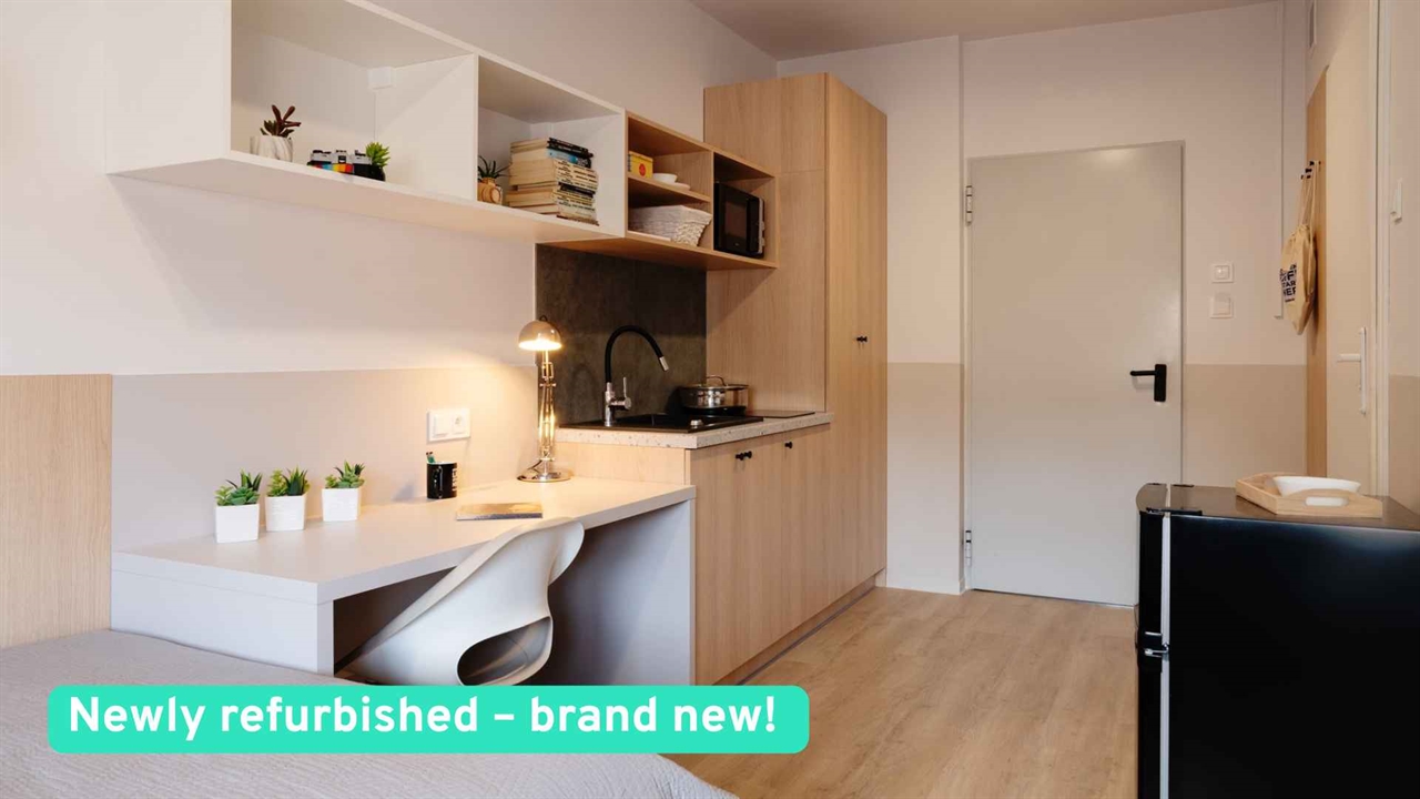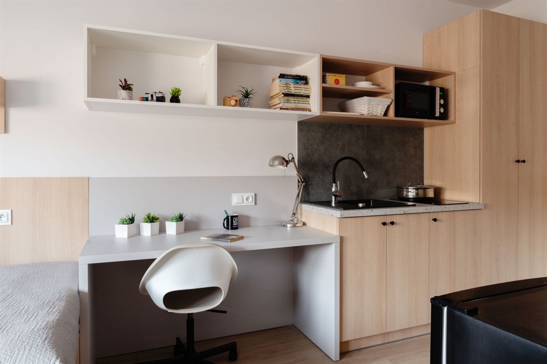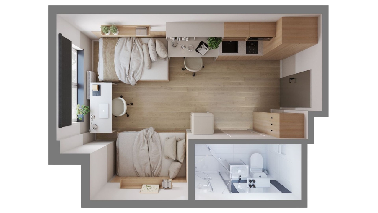 Wasze studio o powierzchni 22 m² jest w pełni wyposażone i otwierane indywidualnymi kartami magnetycznymi. Czekają na Was dwa osobne łóżka, biurka z krzesłami, szafy, szafki wiszące oraz aneks kuchenny z lodówką i płytą grzewczą – wszystko, co potrzebne do wspólnego życia, nauki i odpoczynku. Do dyspozycji macie także prywatną łazienkę z prysznicem. Studio wykończone jest w nowoczesnym, młodzieżowym stylu – tak, żeby czuć się dobrze każdego dnia.